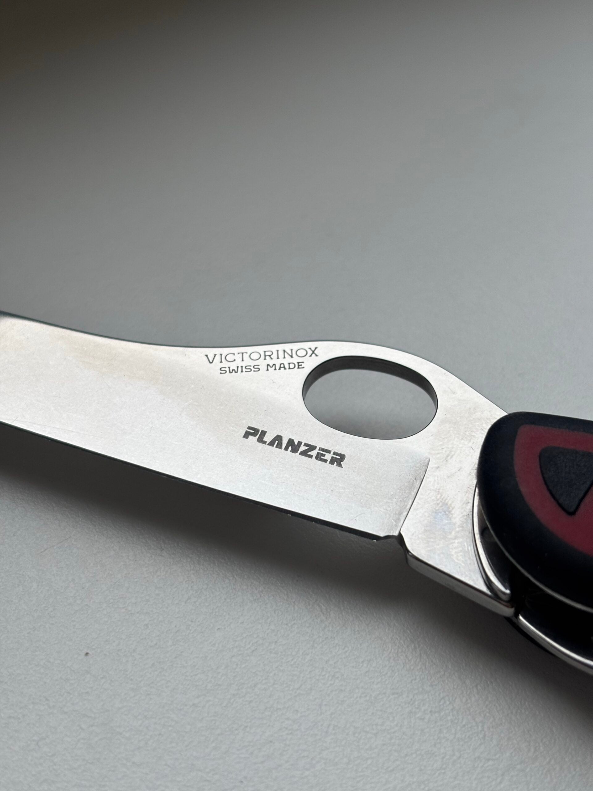 Couteau de poche Victorinox, modèle Forester. Le logo Planzer est discrètement gravé sur la lame.