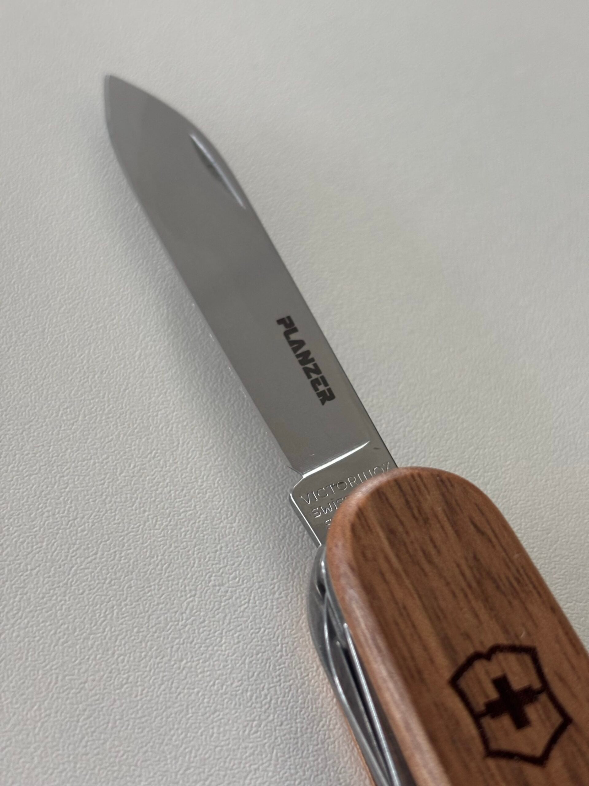 Couteau de poche Victorinox modèle Huntsman. Le logo est discrètement gravé sur la lame.